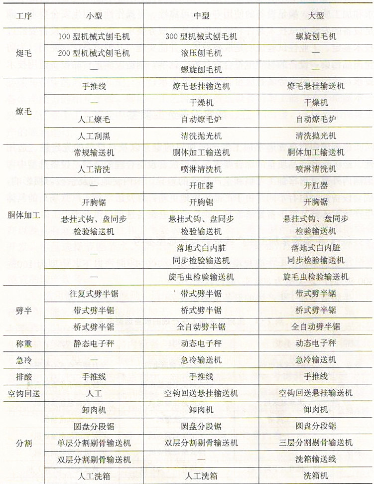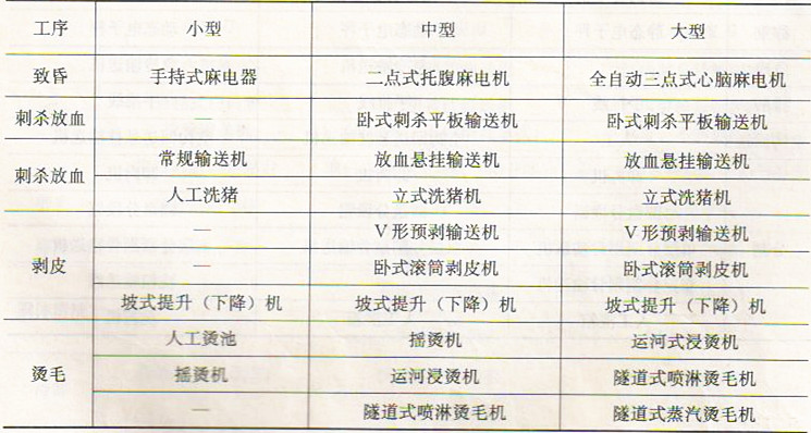 根据国内对畜禽屠宰加工生产线规模的定义以及对设备的先进性,适用性,经济性和产品质量的综合性要求,进行成套设备合理的选型。设备选型中的考虑国内外的畜禽屠宰加工习惯和生产技术的差异,国内受地域及宗教习惯影响,成套设备选型也有不同。由于产品不断的更新,以及屠宰加工厂(场)的具体生产情况不同,以下畜禽屠宰加工生产线成套设备选型仅供参考。